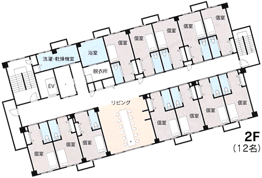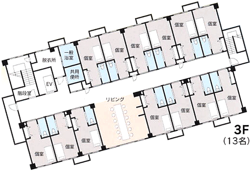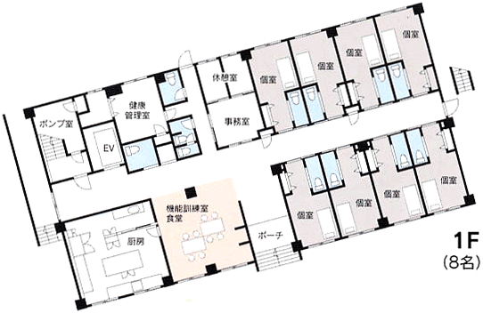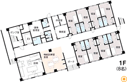 | 全室個室(1部屋18m²)、冷暖房・照明完備、バリアフリー、スプリンクラー、耐火構造、電動ベッド、ナースコールシステム、洗面台、洋式トイレ、クローゼット、TV配線 |
